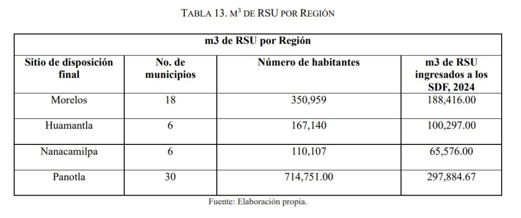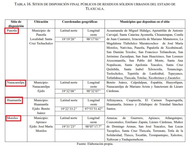 En el documento publicado a principios de este mes se da cuenta de la existencia de cuatro sitios púbicos de disposición final de residuos, administrados por el gobierno, los cuales reciben la totalidad de desechos sólidos urbanos generados en los municipios, e industriales de 89 empresas, que se encuentran ubicados en Atlangatepec, (conocido como Morelos o Apizaco), Nanacamilpa, Huamantla y Panotla (también conocido como Tonsil).
