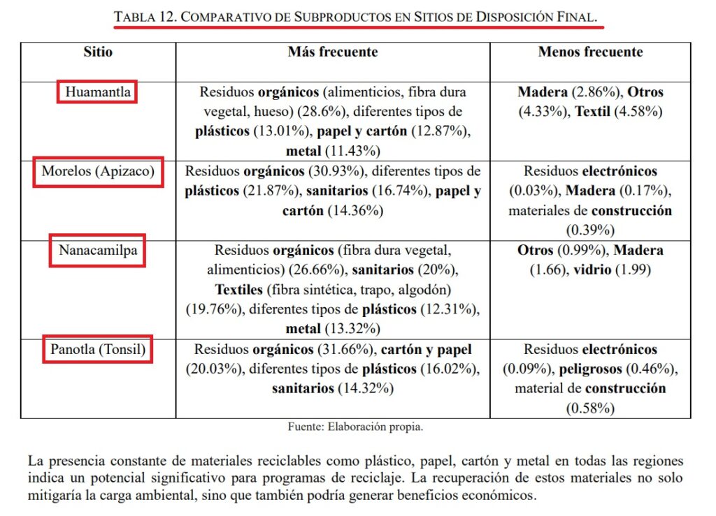 En Nanacamilpa, los desechos sanitarios (20 %) y los textiles (19.76 %) son los más relevantes, después de los orgánicos. Esta composición atípica “podría requerir estrategias de gestión especializadas para evitar problemas de higiene y salud pública”.