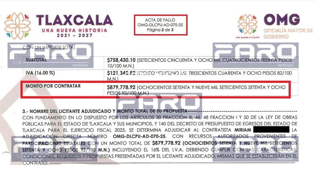 Según el acta de fallo OMG-DLCPU-AD-070-25, la Oficialía Mayor de Gobierno (OMG) dio esa obra a la empresa de Miriam R., por un monto total de 879 mil 778.92 pesos para el desmantelamiento de equipo en cárcamo principal, de reactores, andador y eléctrico en esa planta de tratamiento.