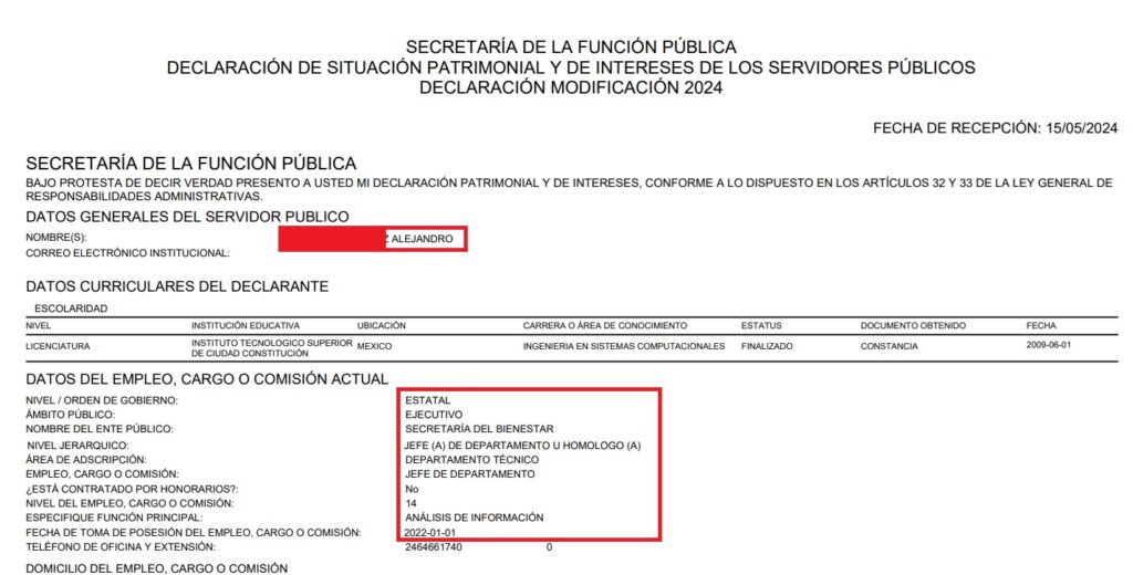 Desde el 1 de enero de 2022 —apenas cuatro meses después de iniciado el mandato de la morenista Lorena Cuéllar Cisneros—, Alejandro A., comenzó a laborar como jefe de departamento en el área de análisis de información en la Secretaría del Bienestar. Según datos extraoficiales, ahí habría laborado hasta antes de ser detenido.