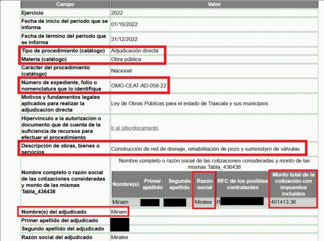 En octubre de 2022 a Miriam R., también por adjudicación directa, le fue otorgado el contrato OMG-CEAT-AD-058-22 por la cantidad de 401 mil 413.36 pesos (IVA incluido) para la construcción de red de drenaje, rehabilitación de pozo y suministro válvulas.