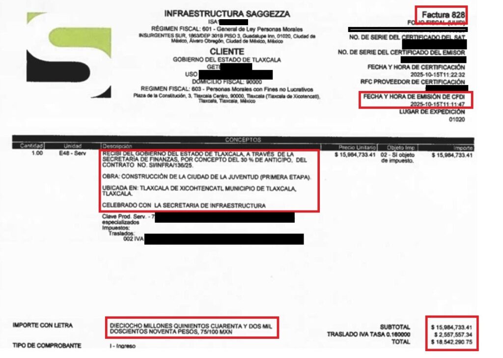 Tras esa determinación, la constructora fue obligada a reintegrar a las arcas estatales los 18 millones 542 mil 290.75 pesos que, a mediados de octubre de 2025, recibió como anticipo del 30 por ciento equivalente al monto total de la inversión para esa obra por 61 millones 807 mil 635 pesos con 83 centavos, según consta en la factura respectiva.